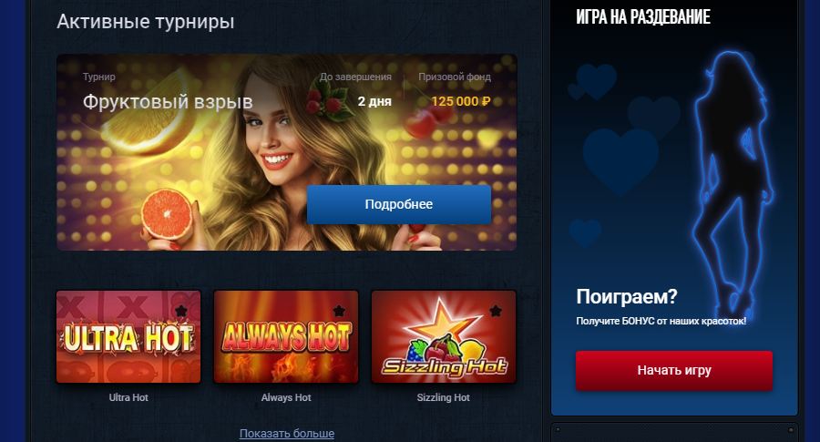Среди зарегистрированных клиентов клуба еженедельно проводятся турниры. Условия состоят в том, что организаторы определяют слоты, на которых игроки в течение 7 дней должны набрать наибольшее количество очков. Администрация выбирает 10 первых игроков в рейтинге и среди них делит призовой фонд.